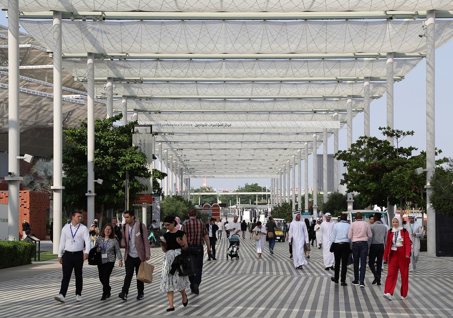 Visitors walk at the Green Zone of the 28th session of the Conference of the Parties to the United Nations Framework Convention on Climate Change (COP28), in Dubai, the United Arab Emirates, Dec. 3, 2023. (Xinhua/Wang Dongzhen)