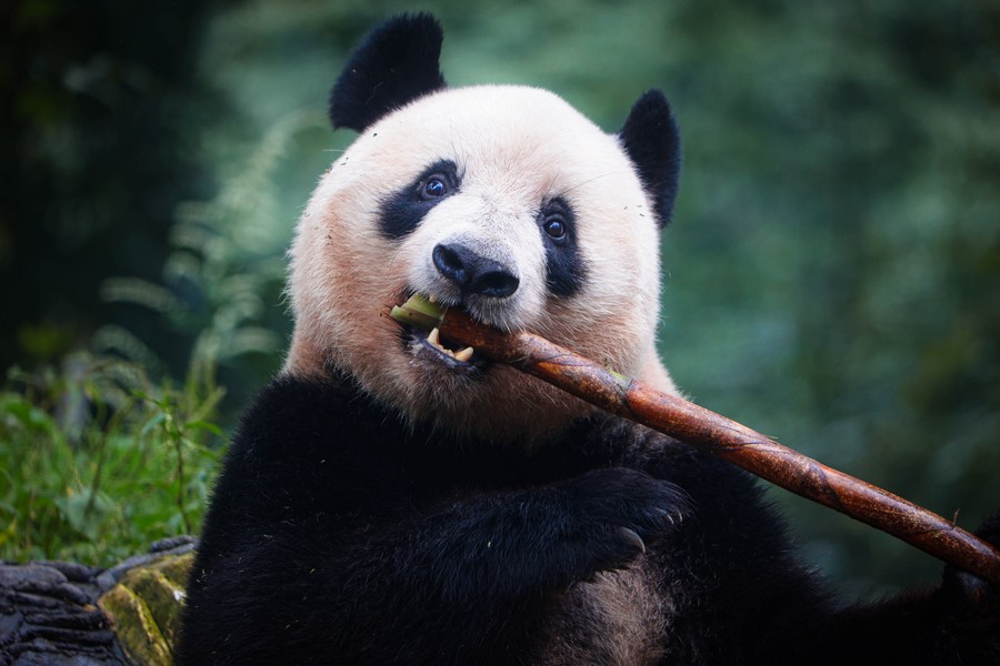 Giant panda Xiang Xiang eats fresh bamboo at the Bifengxia Giant Panda Base in Ya'an, southwest China's Sichuan Province, Oct. 8, 2023. (Photo by Chen Juwei/Xinhua)