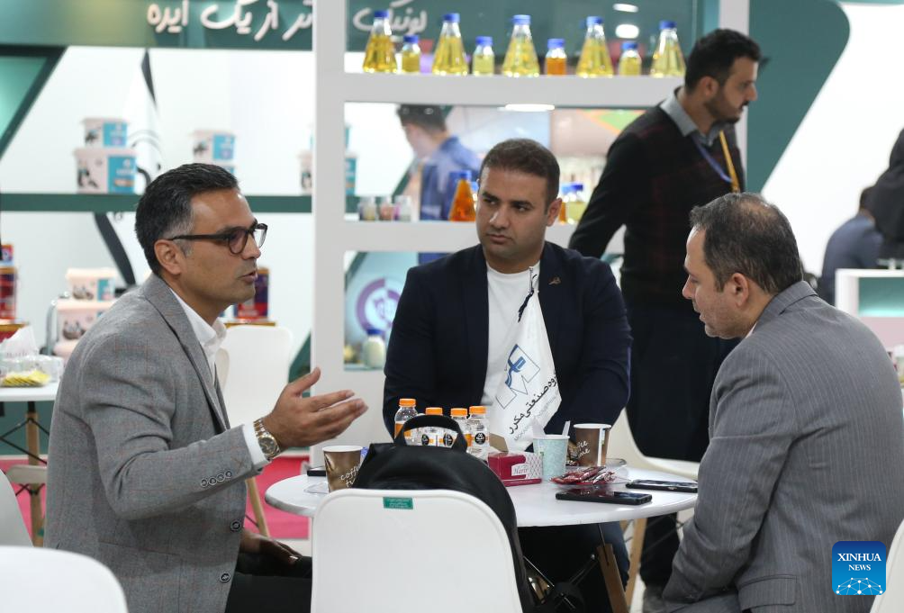An exhibitor talks with visitors at the 23rd International Paint, Resin, Coatings, Composites and Plating Industries Fair in Tehran, Iran, on Dec. 4, 2023. The 23rd International Paint, Resin, Coatings, Composites and Plating Industries Fair opened here on Monday and will continue until Thursday. (Xinhua/Shadati)
