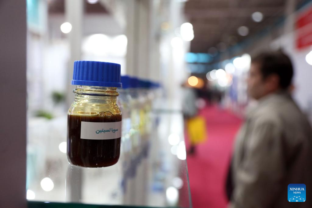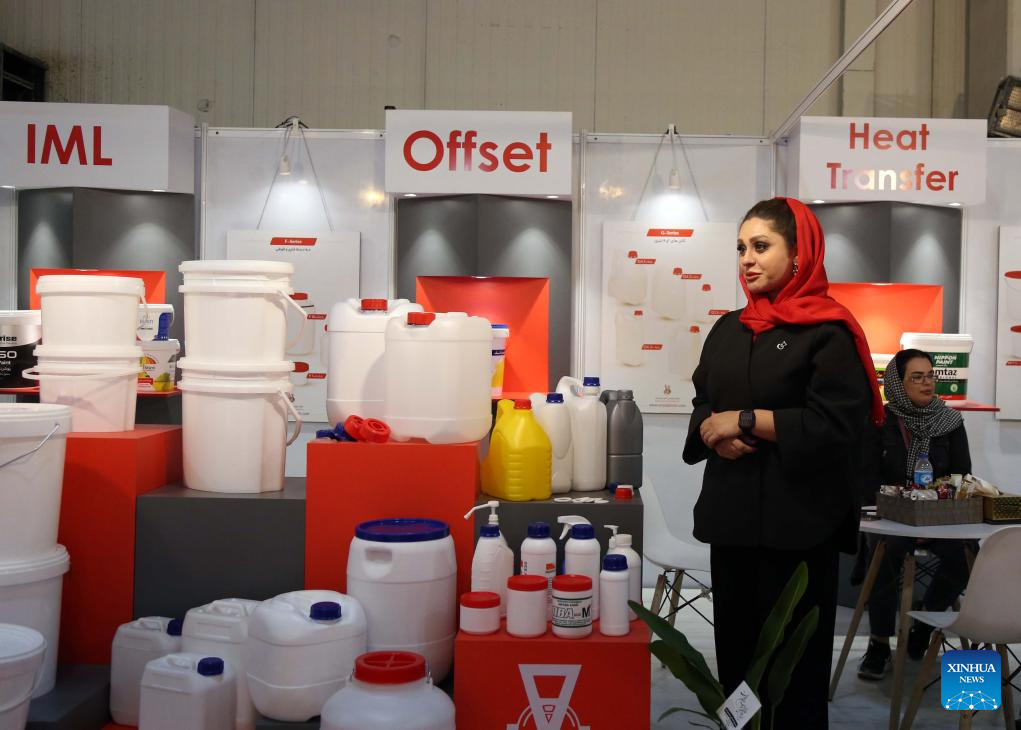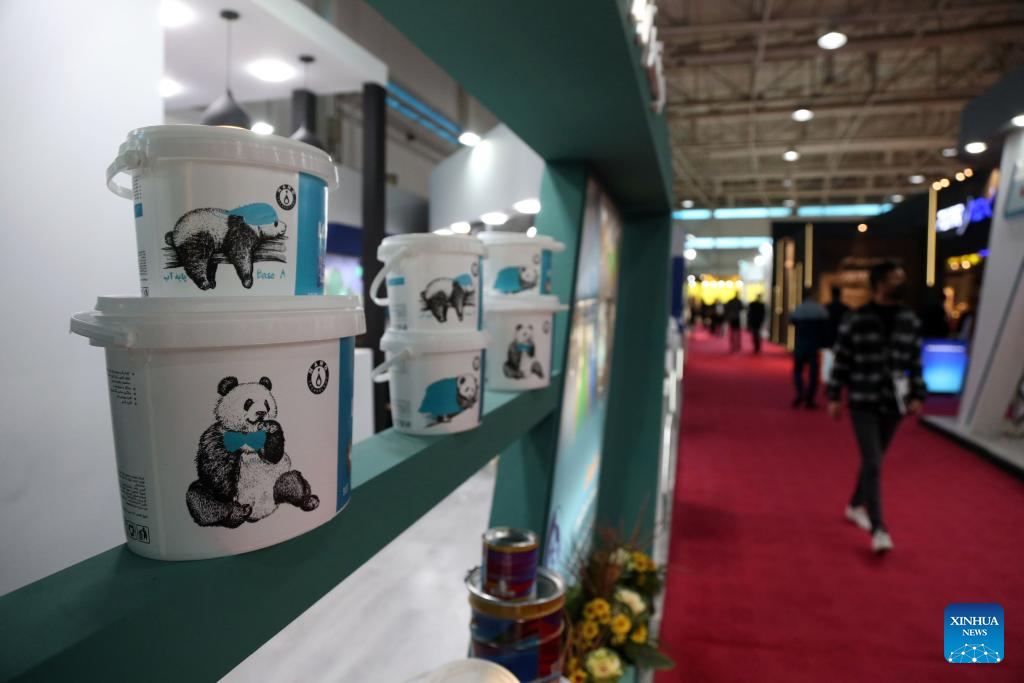 Products are exhibited at the 23rd International Paint, Resin, Coatings, Composites and Plating Industries Fair in Tehran, Iran, on Dec. 4, 2023. The 23rd International Paint, Resin, Coatings, Composites and Plating Industries Fair opened here on Monday and will continue until Thursday. (Xinhua/Shadati)