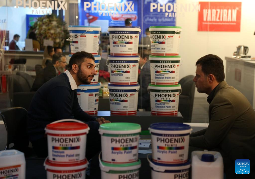 An exhibitor talks with a visitor at the 23rd International Paint, Resin, Coatings, Composites and Plating Industries Fair in Tehran, Iran, on Dec. 4, 2023. The 23rd International Paint, Resin, Coatings, Composites and Plating Industries Fair opened here on Monday and will continue until Thursday. (Xinhua/Shadati)