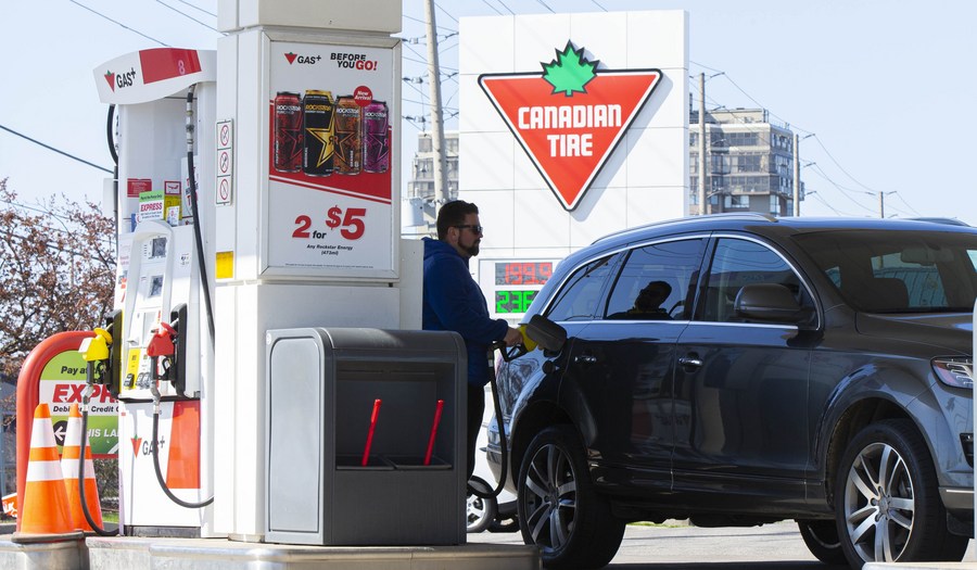 A man fuels his car at a gas station in Toronto, Canada, May 8, 2022. (Photo by Zou Zheng/Xinhua)