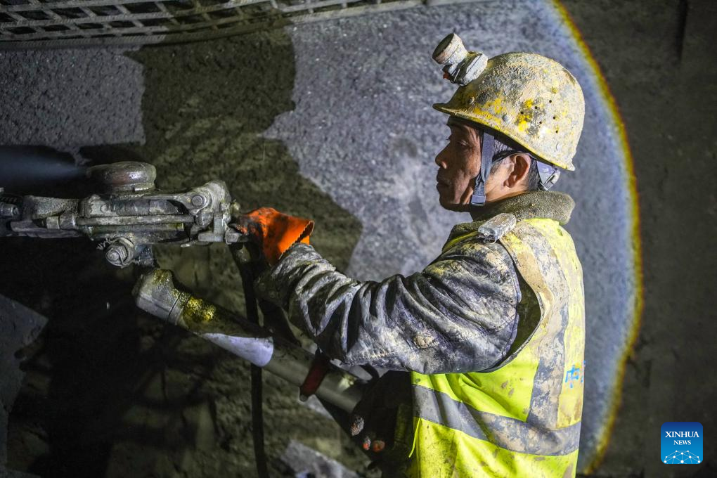 A worker operates at Phupa Tunnel in southwest China's Xizang Autonomous Region, Dec. 4, 2023. The main body of an expressway that will link the cities of Lhasa and Xigaze in southwest China's Xizang Autonomous Region was completed on Tuesday.