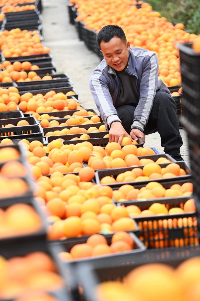 A villager sorts navel oranges at a navel orange base in Luodian County of southwest China's Guizhou Province, Dec. 5, 2023. (Xinhua/Yang Ying)