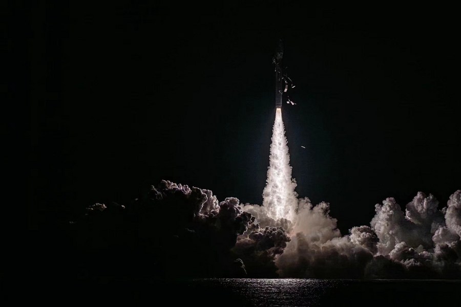 A Smart Dragon-3 carrier rocket carrying a test satellite blasts off from waters off the coast of Yangjiang, south China's Guangdong Province, Nov. 6, 2023. The Taiyuan Satellite Launch Center launched the rocket at 3:24 a.m. (Beijing Time). The test satellite was successfully sent into planned orbit, where it will test satellite internet technologies. (Photo by Zhang Jingyi/Xinhua)