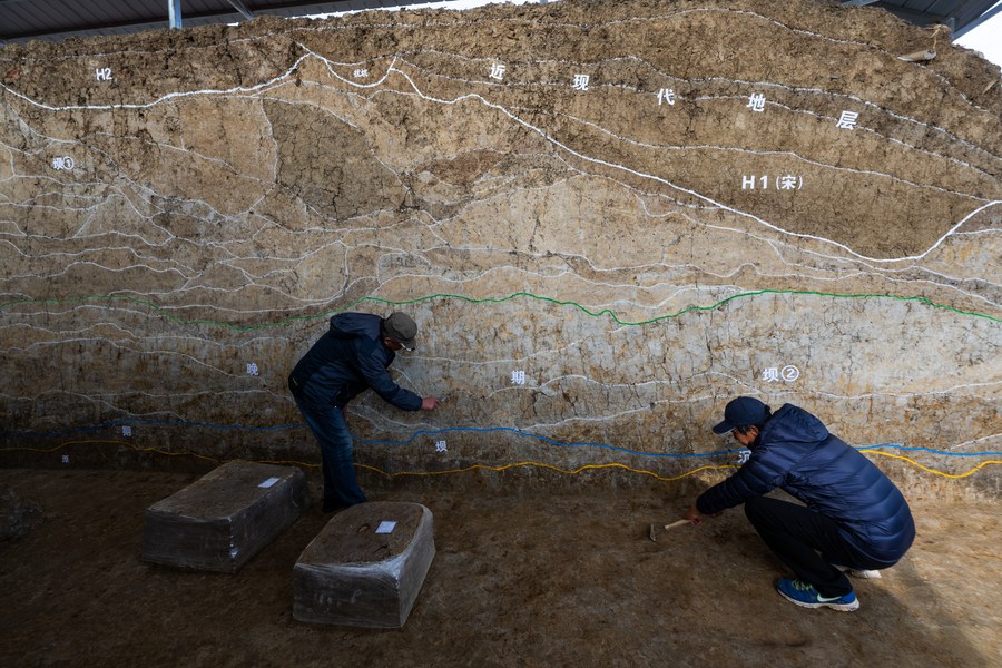 Archeologists work at the relics site of the Xiongjialing Dam in Jingmen, central China's Hubei Province, Dec. 4, 2023. The Xiongjialing Dam, which was initially built around 5,100 years ago, is part of the Qujialing relics site in the city of Jingmen, central China's Hubei Province. The dam, complete with a reservoir and spillway, has been identified as China's earliest known water conservancy project. The design of the dam suggests that ancient people in the area had learned to harness water based on the landform rather than simply implementing measures to defend themselves against floods, said He Nu, a researcher with the Institute of Archaeology, Chinese Academy of Social Sciences. (Xinhua/Xiao Yijiu)