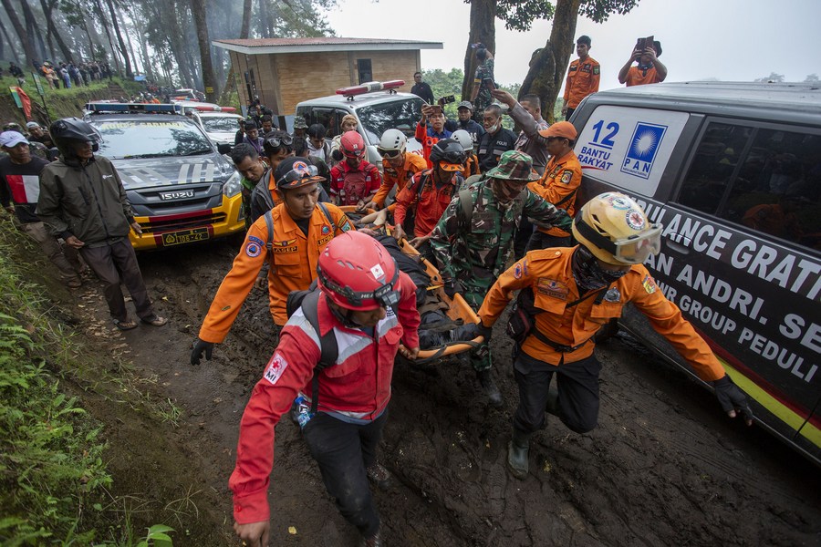 Rescuers transfer the injured near Marapi volcano in West Sumatra, Indonesia, Dec. 4, 2023. The number of climbers who died in the eruption of the Marapi volcano has reached 23, according to the West Sumatra Natural Resources Conservation Agency on Tuesday. (Photo by Andri Mardiansyah/Xinhua)■
