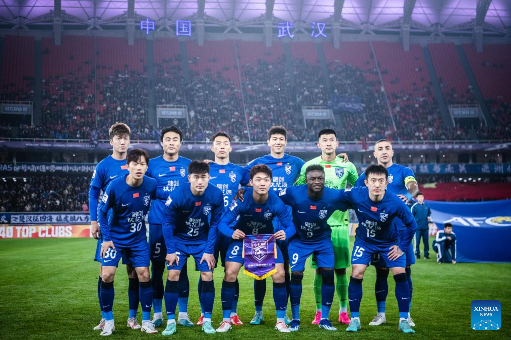 Start players of Wuhan Three Towns FC pose for group photos before the AFC Champions league football match between Wuhan Three Towns FC of China and Pohang Steelers of South Korea at Wuhan Sports Center Stadium in Wuhan, central China's Hubei Province, Dec. 6, 2023. (Xinhua/Wu Zhizun)