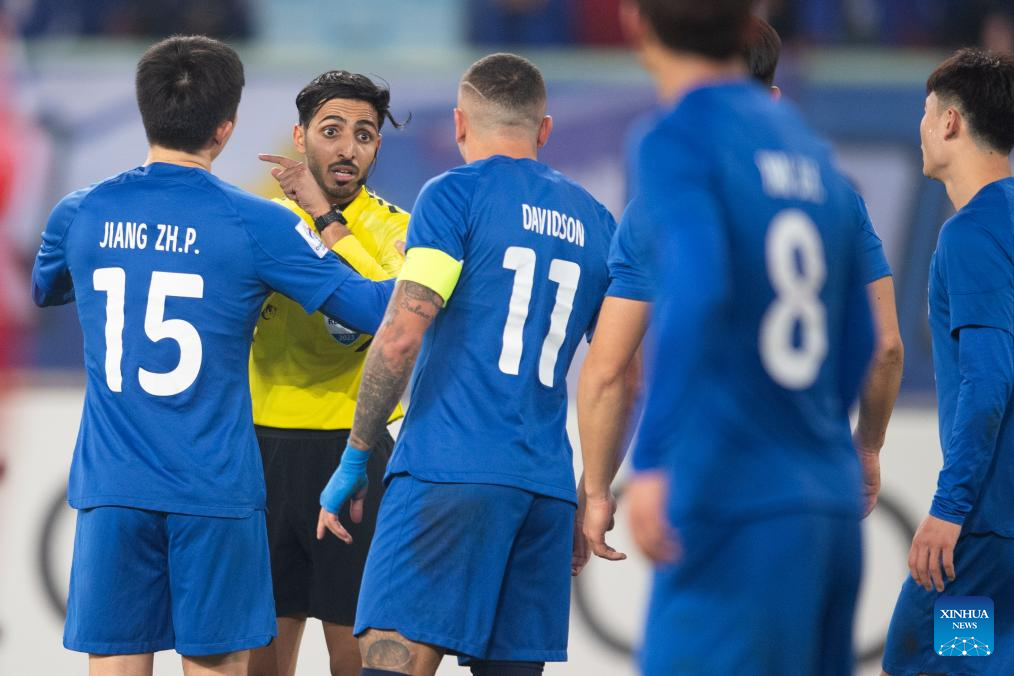 Referee Abdulla Ali Al-Marri (2nd L) of Qatar talks to Davidson Pereira (3rd L) of Wuhan Three Towns FC during the AFC Champions league football match between Wuhan Three Towns FC of China and Pohang Steelers of South Korea at Wuhan Sports Center Stadium in Wuhan, central China's Hubei Province, Dec. 6, 2023. (Xinhua/Xiao Yijiu)