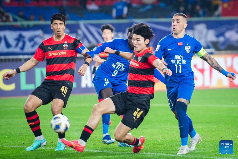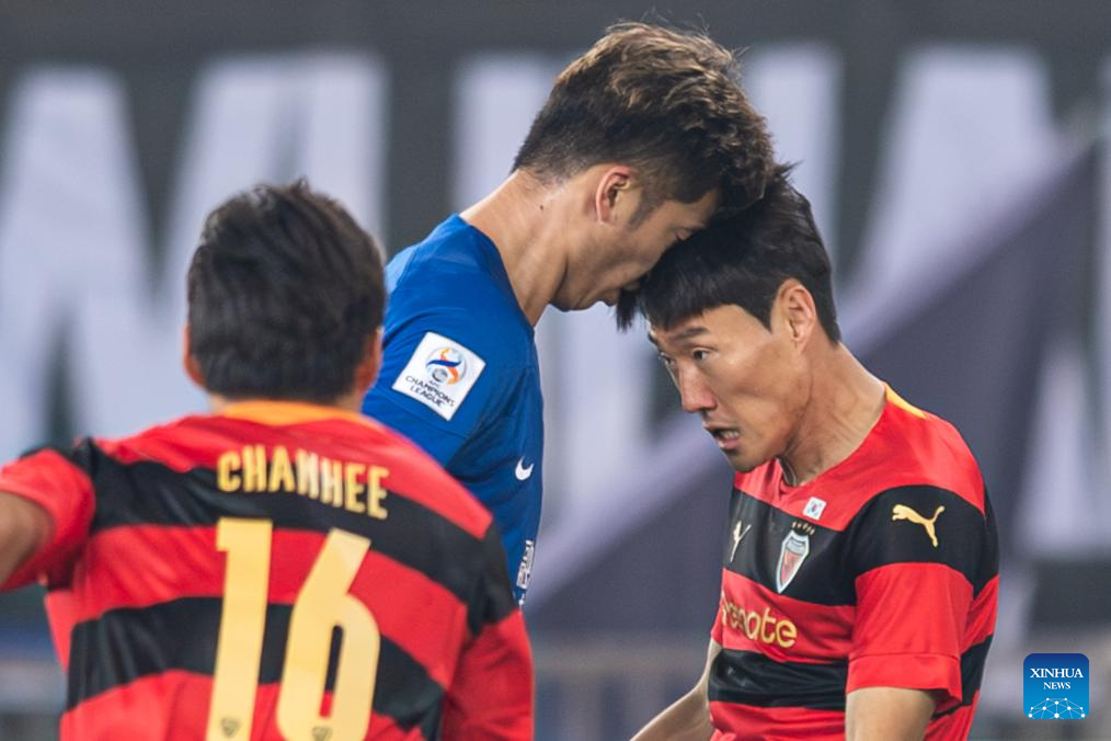 Lee Gyu-Baek (2nd R) of Pohang Steelers shoots an own goal during the AFC Champions league football match between Wuhan Three Towns FC of China and Pohang Steelers of South Korea at Wuhan Sports Center Stadium in Wuhan, central China's Hubei Province, Dec. 6, 2023. (Xinhua/Wu Zhizun)