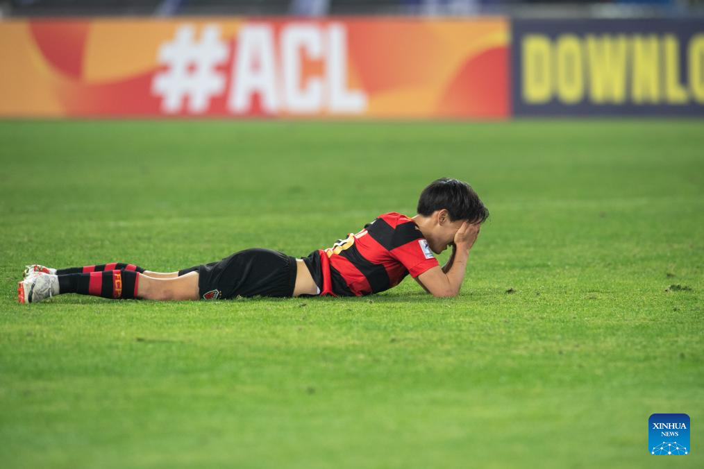 Cho Jae-Hun of Pohang Steelers reacts after missing a chance to score during the AFC Champions league football match between Wuhan Three Towns FC of China and Pohang Steelers of South Korea at Wuhan Sports Center Stadium in Wuhan, central China's Hubei Province, Dec. 6, 2023. (Xinhua/Xiao Yijiu)