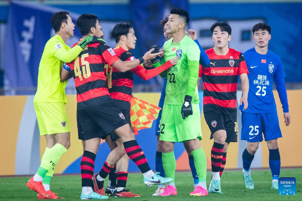 Players from both sides quarrel during the AFC Champions league football match between Wuhan Three Towns FC of China and Pohang Steelers of South Korea at Wuhan Sports Center Stadium in Wuhan, central China's Hubei Province, Dec. 6, 2023. (Xinhua/Wu Zhizun)