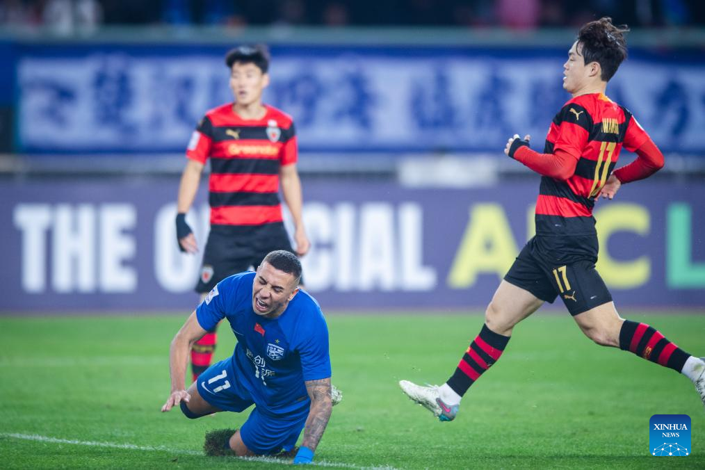 Davidson Pereira (L) of Wuhan Three Towns FC falls during the AFC Champions league football match between Wuhan Three Towns FC of China and Pohang Steelers of South Korea at Wuhan Sports Center Stadium in Wuhan, central China's Hubei Province, Dec. 6, 2023. (Xinhua/Wu Zhizun)