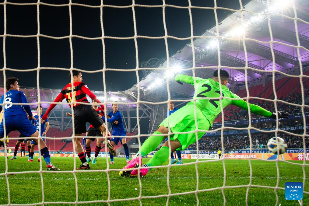 Wuhan Three Towns FC's goalkeeper Liu Dianzuo (front) fails to save the goal by Lee Ho-Jae of Pohang Steelers during the AFC Champions league football match between Wuhan Three Towns FC of China and Pohang Steelers of South Korea at Wuhan Sports Center Stadium in Wuhan, central China's Hubei Province, Dec. 6, 2023. (Xinhua/Xiao Yijiu)