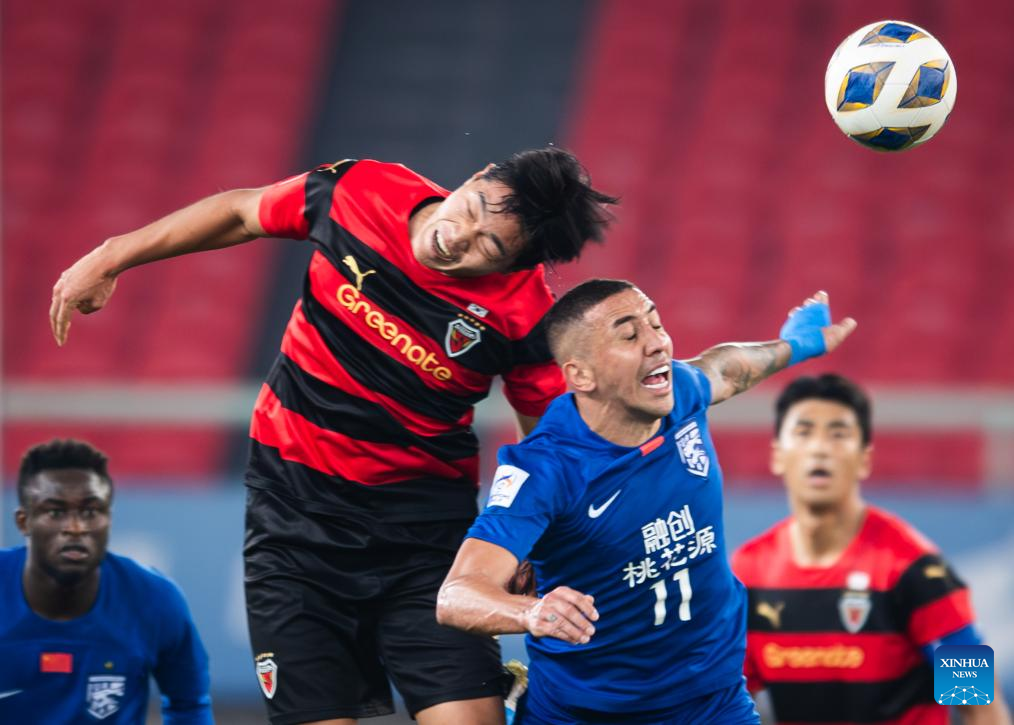 Lee Ho-Jae (top) of Pohang Steelers heads for the ball and scores during the AFC Champions league football match between Wuhan Three Towns FC of China and Pohang Steelers of South Korea at Wuhan Sports Center Stadium in Wuhan, central China's Hubei Province, Dec. 6, 2023. (Xinhua/Xiao Yijiu)