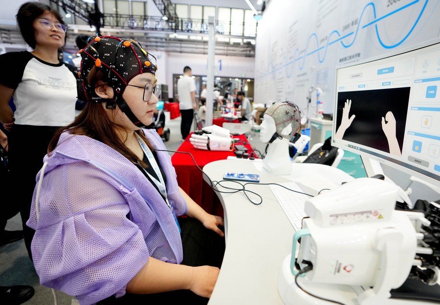 A staff member demonstrates a brain-computer interface for post-stroke rehabilitation at the World Robot Conference 2023 in Beijing, capital of China, Aug. 16, 2023. (Xinhua/Wang Yuguo)