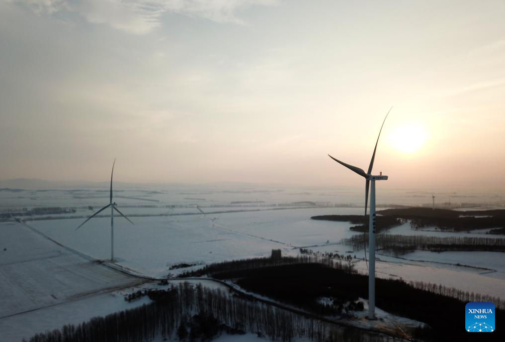 This photo taken on Dec. 5, 2023 shows wind turbines in operation in Yilan County, northeast China's Heilongjiang Province. Heilongjiang, the northernmost province in China, is now largely covered in ice and snow, but the construction and operation of the 200-megawatt fourth phase of a wind farm project in Yilan County of the province are by no means "frozen."