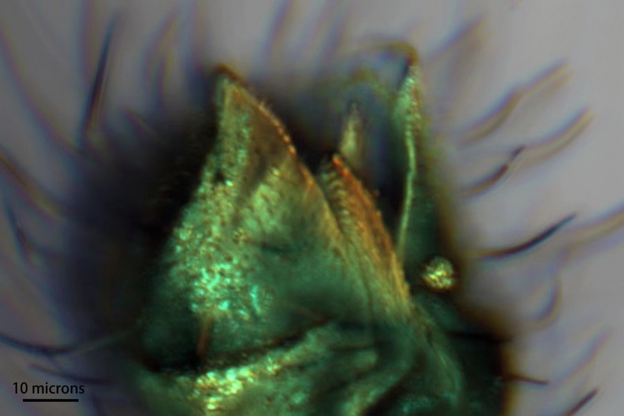This undated photo, captured with a laser scanning confocal microscope and provided by the Nanjing Institute of Geology and Paleontology under the Chinese Academy of Sciences, shows the piercing mouth part of a male mosquito. (Xinhua)