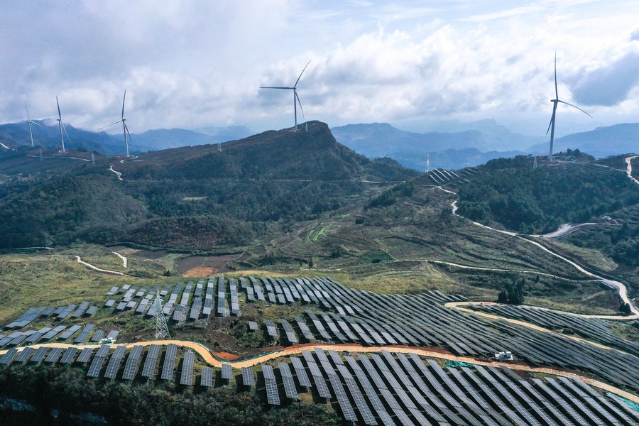 This aerial photo taken on Nov. 16, 2023 shows the Dingdongpo wind power-photovoltaic project in Shiqian County of Tongren City, southwest China's Guizhou Province. (Xinhua/Yang Wenbin)