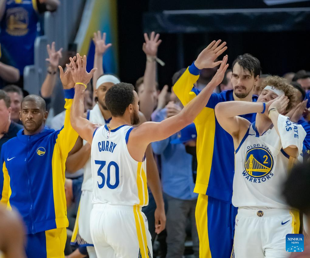Stephen Curry (front) of Golden State Warriors celebrates during the NBA basketball game against Portland Trail Blazers in San Francisco, the United States, Dec. 6, 2023. (Photo by Dong Xudong/Xinhua)