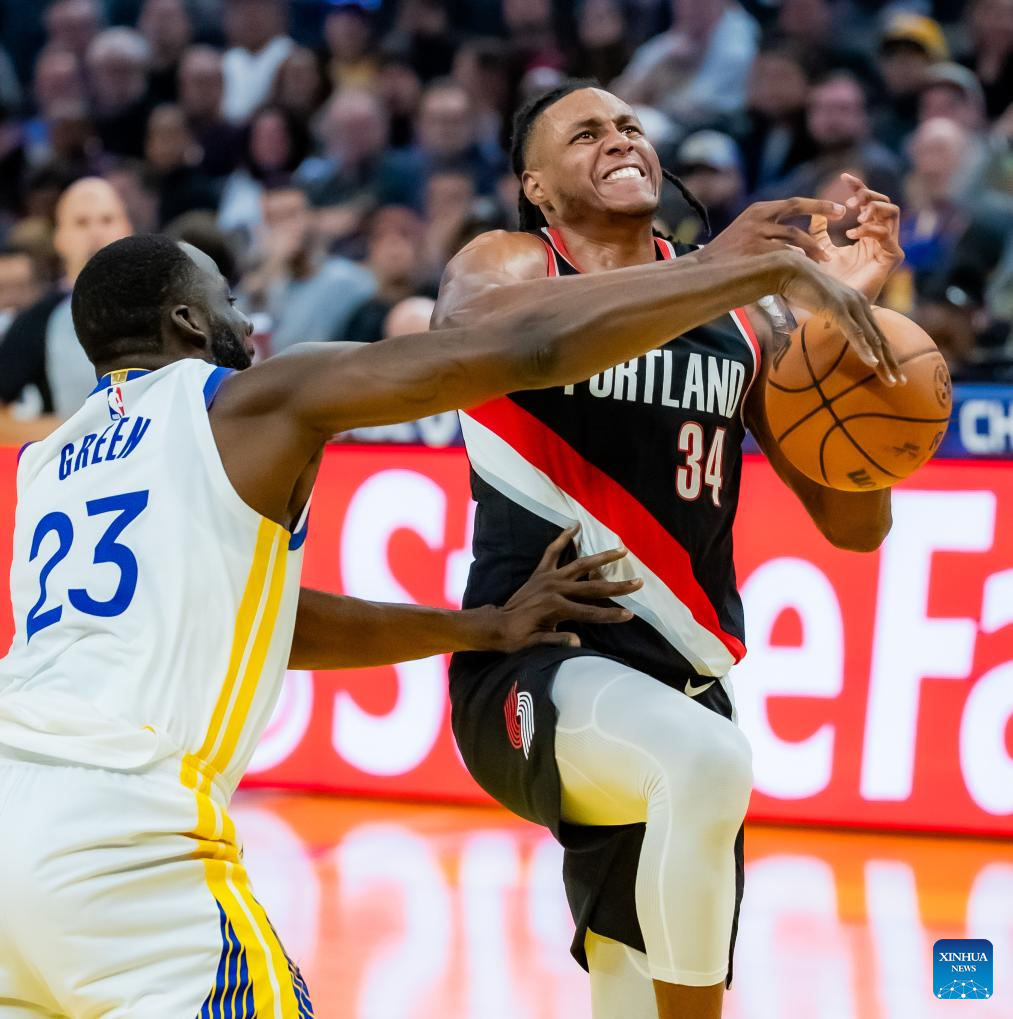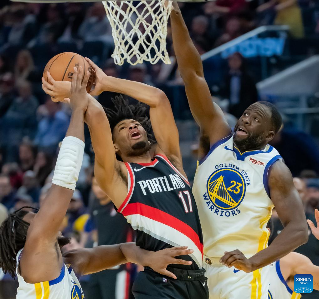 Jabari Walker (R) of Portland Trail Blazers is blocked during the NBA basketball game against Golden State Warriors in San Francisco, the United States, Dec. 6, 2023. (Photo by Dong Xudong/Xinhua)