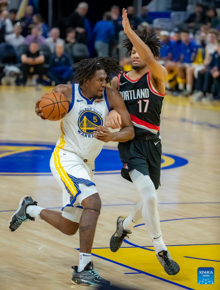 Kevon Looney (L) of Golden State Warriors drives the ball during the NBA basketball game against Portland Trail Blazers in San Francisco, the United States, Dec. 6, 2023. (Photo by Dong Xudong/Xinhua)