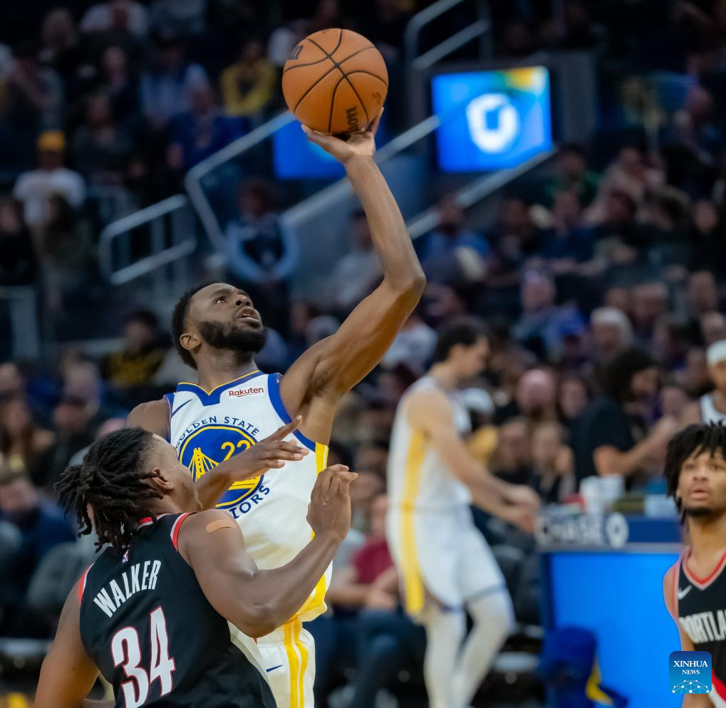 Andrew Wiggins (front R) of Golden State Warriors shoots the ball during the NBA basketball game against Portland Trail Blazers in San Francisco, the United States, Dec. 6, 2023. (Photo by Dong Xudong/Xinhua)