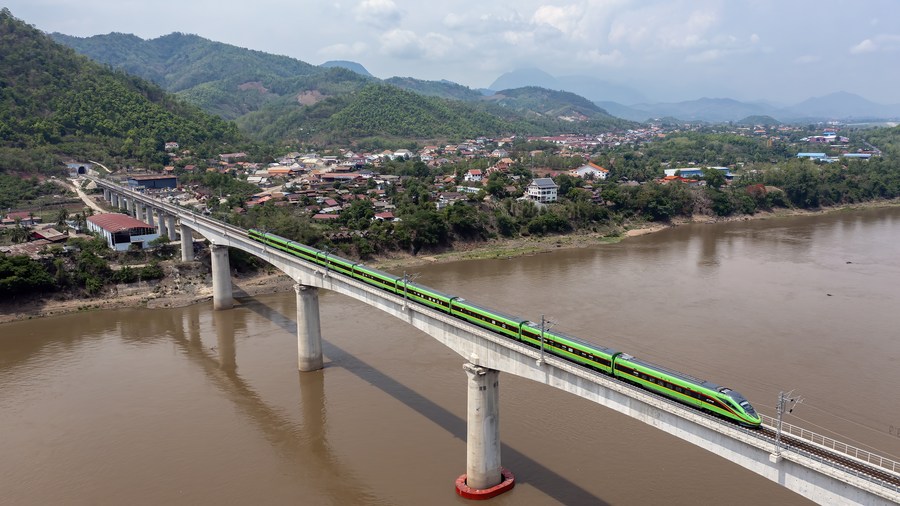 A train drives on the China-Laos Railway's Luang Prabang cross-Mekong River super major bridge in Laos, May 28, 2023. (Photo by Chen Chang/Xinhua)