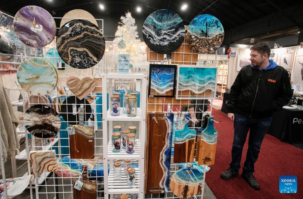 A person visits the Make It show in Vancouver, British Columbia, Canada, Dec. 8, 2023. The trade event dedicated to handmade items features exhibitors from across Canada, offering a diverse range of handmade goods. (Photo by Liang Sen/Xinhua)