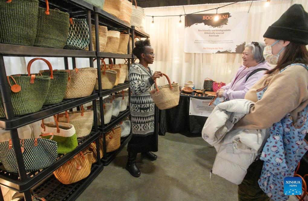 People visit the Make It show in Vancouver, British Columbia, Canada, Dec. 8, 2023. The trade event dedicated to handmade items features exhibitors from across Canada, offering a diverse range of handmade goods. (Photo by Liang Sen/Xinhua)
