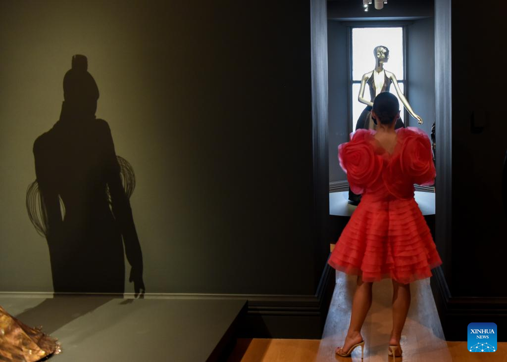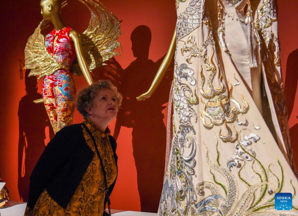A person watches the creations by Chinese couturier Guo Pei in Auckland, New Zealand, Dec. 8, 2023. The exhibition "Fashion, Art, Fantasy" from Saturday will showcase over 60 striking garments from Guo Pei's two-decade-long career, inviting New Zealanders to immerse themselves in the grandeur of her art couture. (Xinhua/Guo Lei)