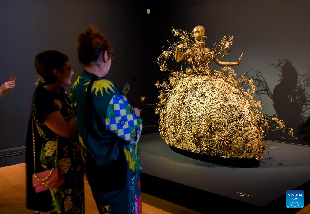 Visitors watch a creation by Chinese couturier Guo Pei in Auckland, New Zealand, Dec. 8, 2023. The exhibition "Fashion, Art, Fantasy" from Saturday will showcase over 60 striking garments from Guo Pei's two-decade-long career, inviting New Zealanders to immerse themselves in the grandeur of her art couture. (Xinhua/Guo Lei)