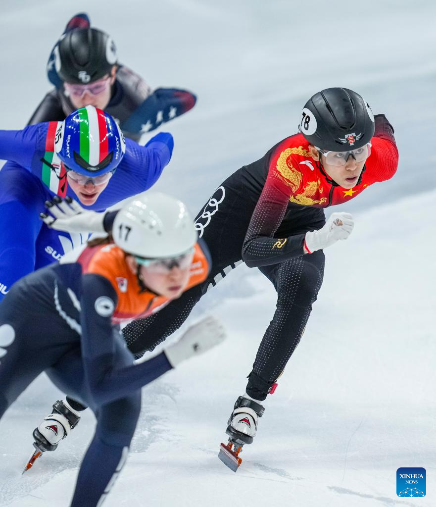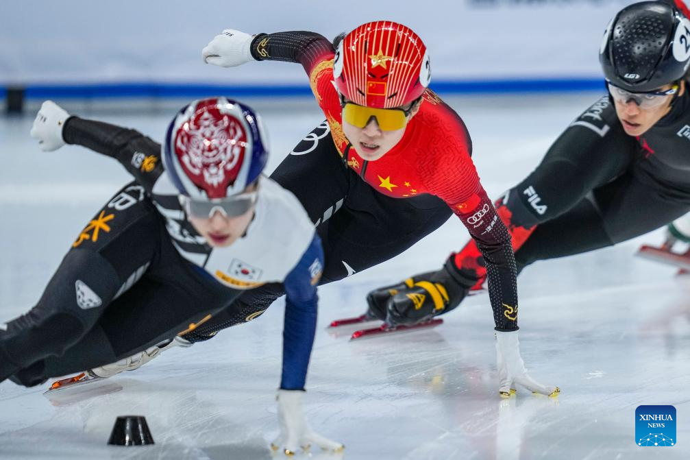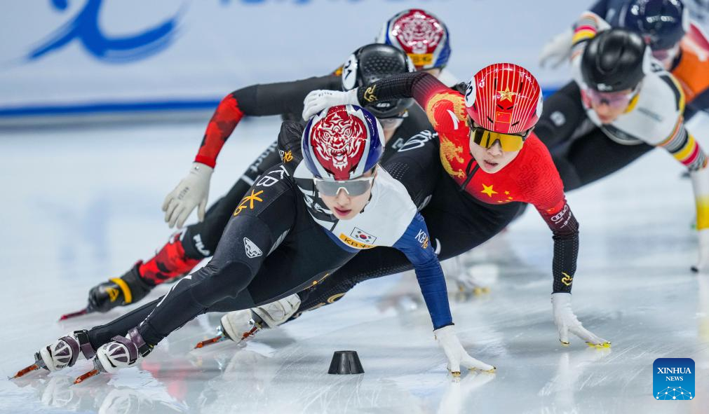 Gong Li (C) of China competes during the women's 1500m final at the ISU World Cup Short Track Speed Skating series in Beijing, China, Dec. 9, 2023. (Xinhua/Sun Fei)