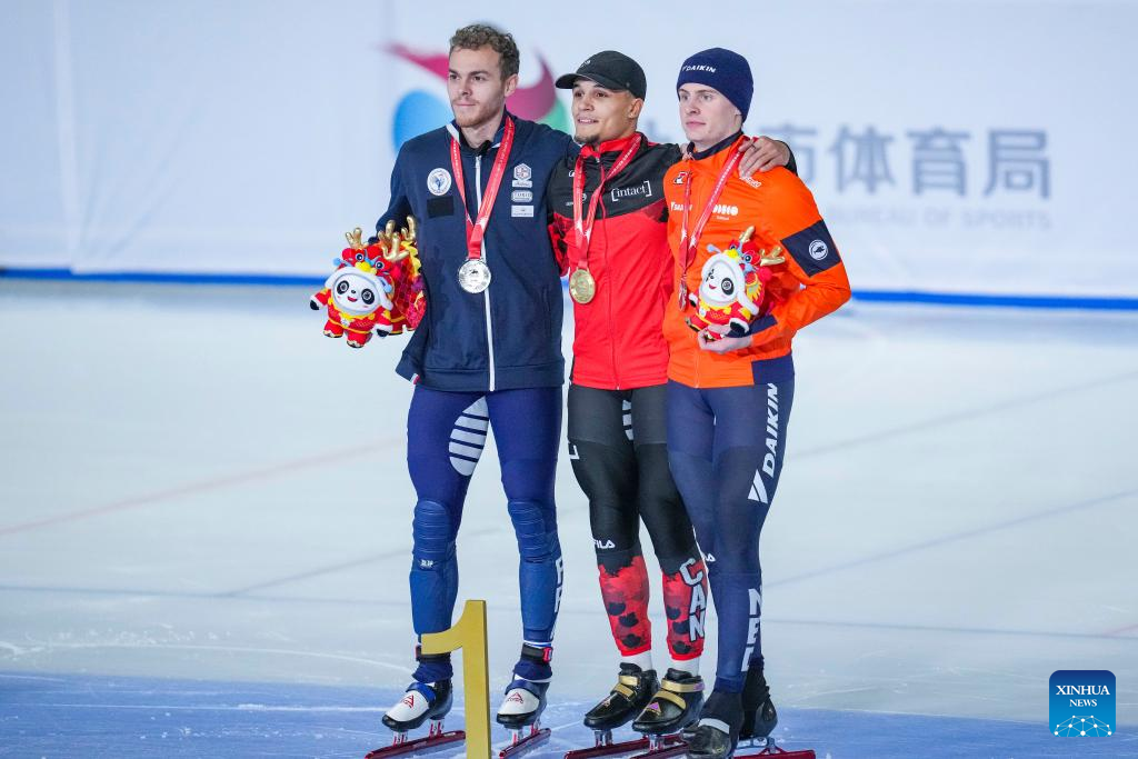 Gold medalist Jordan Pierre-Gilles (C) of Canada, silver medalist Quentin Fercoq (L) of France and bronze medalist Jens van 'T Wout of the Netherlands pose during the awarding ceremony for the men's 500m event at the ISU World Cup Short Track Speed Skating series in Beijing, China, Dec. 9, 2023. (Xinhua/Sun Fei)