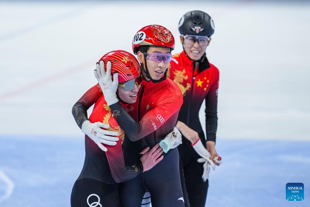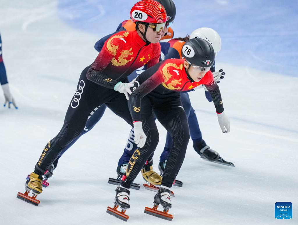 Lin Xiaojun (front L) and Fan Kexin (front R) of China compete during the mixed team relay final A at the ISU World Cup Short Track Speed Skating series in Beijing, China, Dec. 9, 2023. (Xinhua/Sun Fei)
