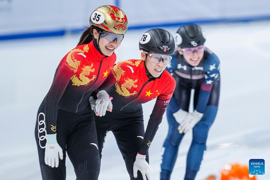 Fan Kexin (C), Wang Ye (L) of China celebrate after the women's 500m final at the ISU World Cup Short Track Speed Skating series in Beijing, China, Dec. 9, 2023. (Xinhua/Sun Fei)