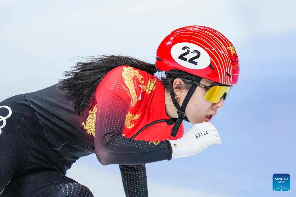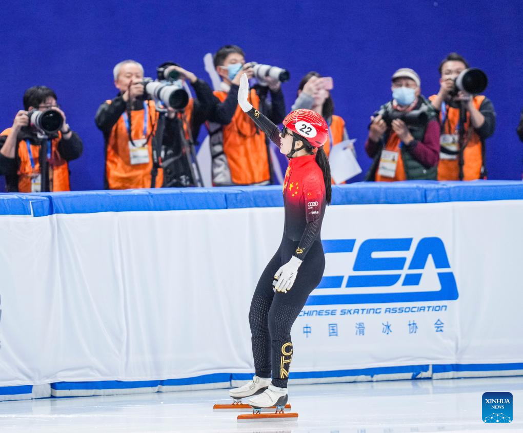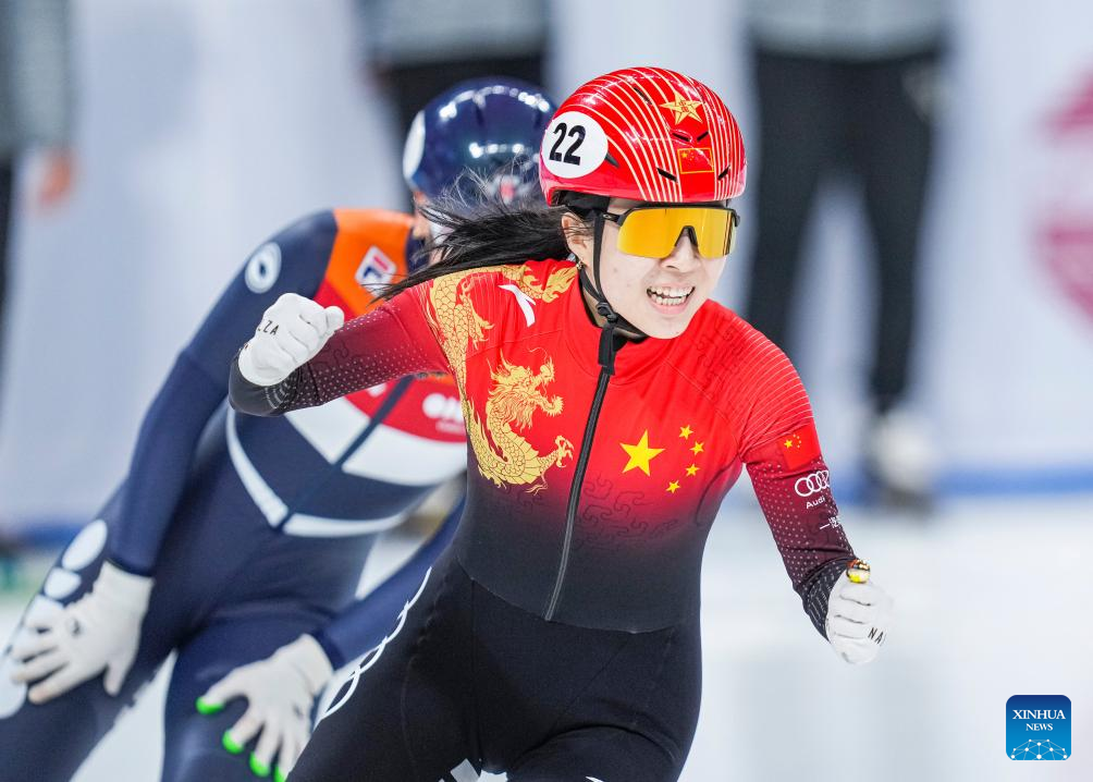 Gong Li of China competes during the women's 1500m final at the ISU World Cup Short Track Speed Skating series in Beijing, China, Dec. 9, 2023. (Xinhua/Sun Fei)