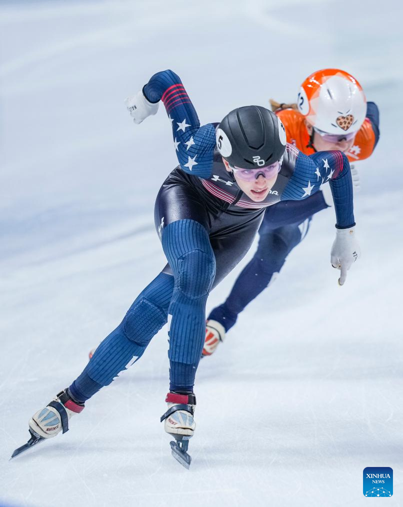 Kristen Santos-Griswold of the United States competes during the women's 500m final at the ISU World Cup Short Track Speed Skating series in Beijing, China, Dec. 9, 2023. (Xinhua/Sun Fei)