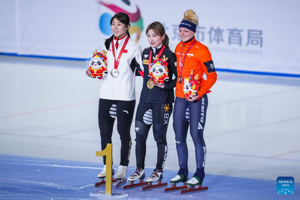 Gold medalist Kim Gilli (C) of South Korea, silver medalist Gong Li (L) of China, bronze medalist Xandra Velzeboer of the Netherlands pose during the awarding ceremony for the women's 1500m event at the ISU World Cup Short Track Speed Skating series in Beijing, China, Dec. 9, 2023. (Xinhua/Sun Fei)