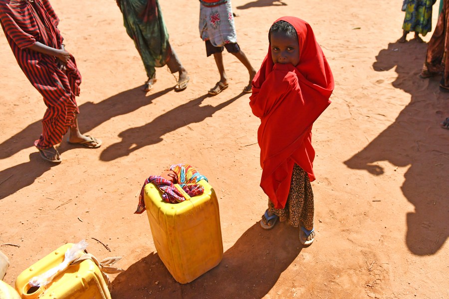 Photo taken on March 19, 2017 shows a little girl waiting to get water at an Internal Displaced Person (IDP) camp in Doolow, a border town with Ethiopia, Somalia. (Xinhua/Sun Ruibo)