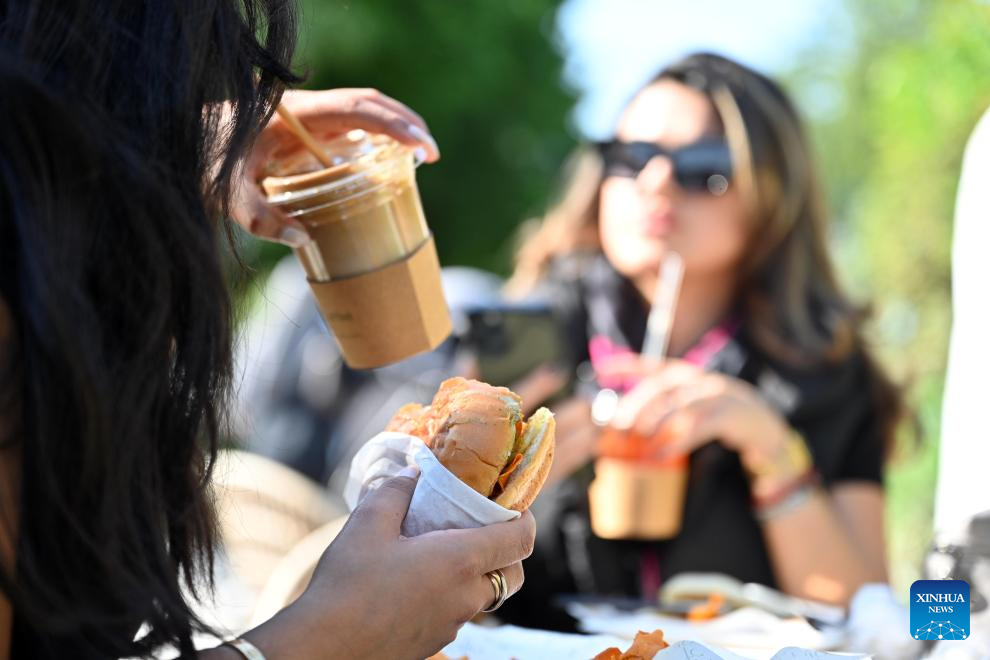 A woman enjoys food during the Qout Market Food Festival in Capital Governorate, Kuwait, Dec. 9, 2023. Nearly 100 local companies participated in the festival on Saturday. (Photo by Asad/Xinhua)