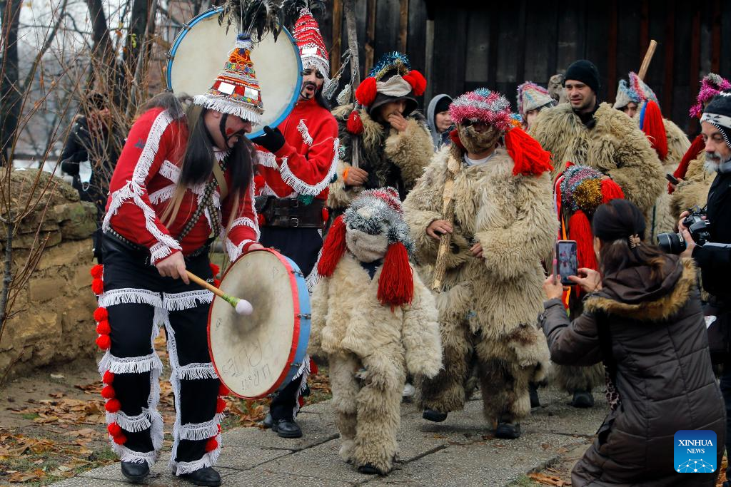 Members of a traditional song and dance band attend a parade during the "White Flowers" festival of traditions and customs at the Village Museum in Bucharest, capital of Romania, on Dec. 10, 2023. The festival is organized annually with the aim of presenting Christmas and New Year traditions to the public. (Photo by Cristian Cristel/Xinhua)