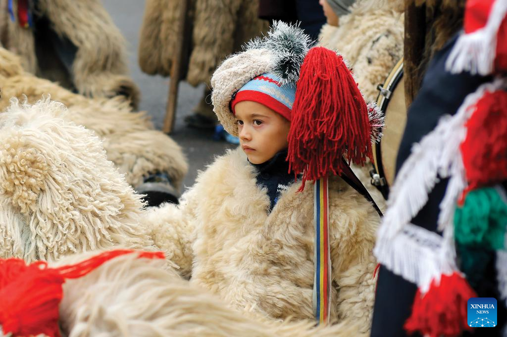A child of a traditional song and dance band attends the "White Flowers" festival of traditions and customs at the Village Museum in Bucharest, capital of Romania, on Dec. 10, 2023. The festival is organized annually with the aim of presenting Christmas and New Year traditions to the public. (Photo by Cristian Cristel/Xinhua)
