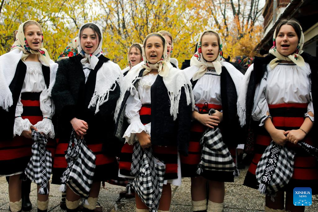 Members of a traditional song and dance band sing during the "White Flowers" festival of traditions and customs at the Village Museum in Bucharest, capital of Romania, on Dec. 10, 2023. The festival is organized annually with the aim of presenting Christmas and New Year traditions to the public. (Photo by Cristian Cristel/Xinhua)