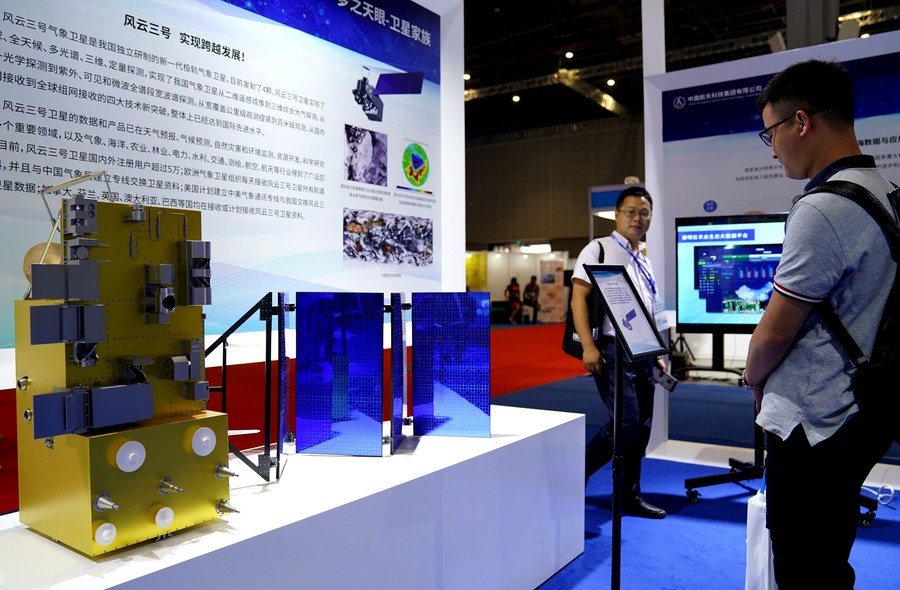 A visitor views a model of Fengyun-3 satellite during the 2019 China International Industry Fair in east China's Shanghai, Sept. 17, 2019. (Xinhua/Zhang Jiansong)