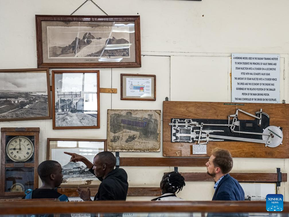 Sevily Mwailemi (Front), a locomotive driver with over three decades of experience, introduces exhibits at the Nairobi Railway Museum in Nairobi, Kenya, on Nov. 27, 2023. The Nairobi Railway Museum, nestled in Nairobi's bustling downtown, remains a popular destination for both locals and tourists eager to delve into Kenya's rich history. (Xinhua/Li Yahui)