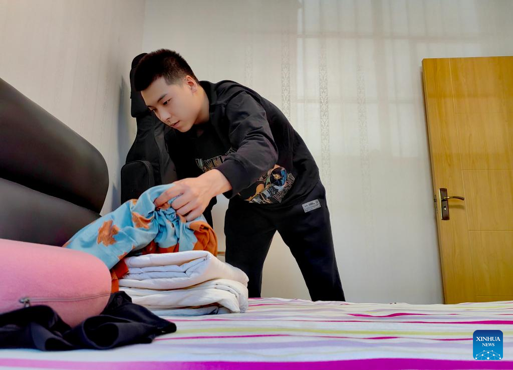 Yang Zhiyang tidies the room for his mother Su Jing at their home in Baoji City of northwest China's Shaanxi Province, Aug. 31, 2023. (Xinhua/Sun Zhenghao)