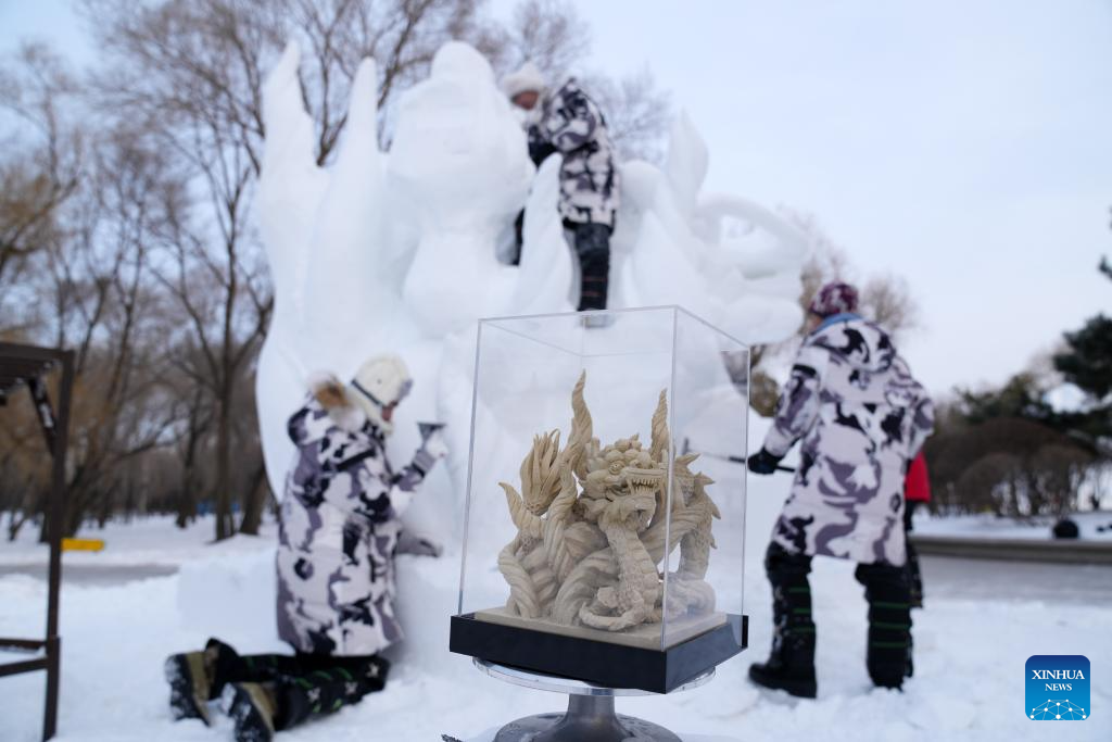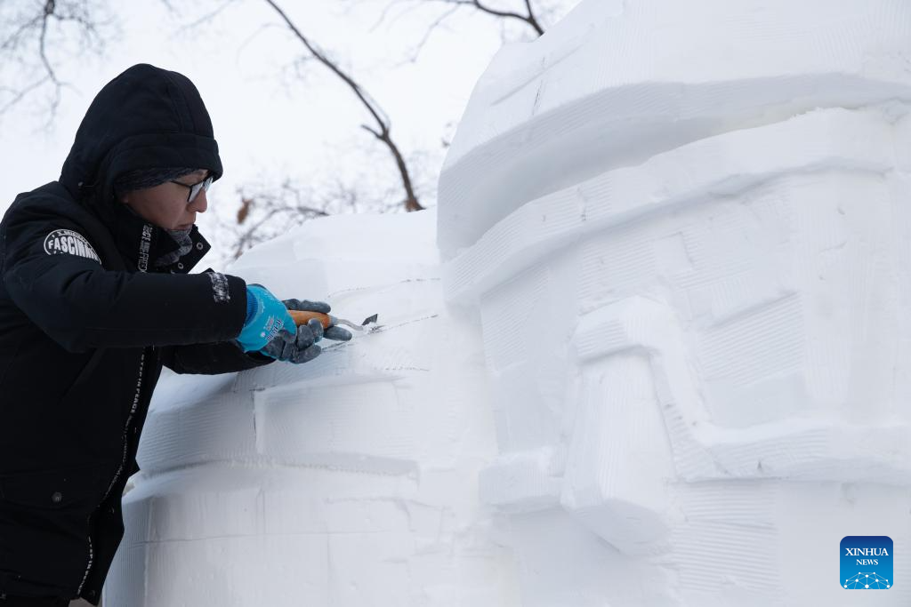 A sculptor works on a snow sculpture during a snow competition in Harbin, northeast China's Heilongjiang Province, Dec. 12, 2023. With numerous snow sculptures constructed in the theme park titled "snow world", the city of Harbin, known as China's "ice city" in the northeast, is witnessing the coming of its high season for tourism. (Xinhua/Wang Jianwei)