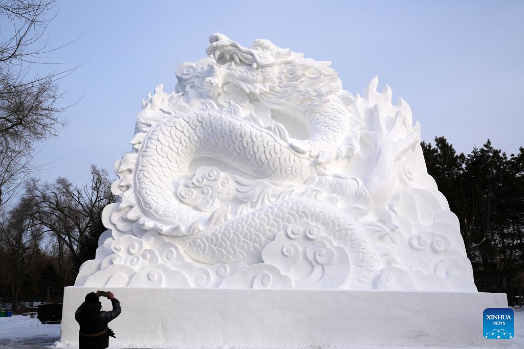 A sculptor takes a photo of a giant snow sculpture at the Sun Island scenic area in Harbin, northeast China's Heilongjiang Province, Dec. 12, 2023. With numerous snow sculptures constructed in the theme park titled "snow world", the city of Harbin, known as China's "ice city" in the northeast, is witnessing the coming of its high season for tourism. (Xinhua/Wang Jianwei)