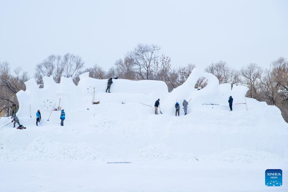 Sculptors work on a giant snow sculpture at the Sun Island scenic area in Harbin, northeast China's Heilongjiang Province, Dec. 12, 2023. With numerous snow sculptures constructed in the theme park titled "snow world", the city of Harbin, known as China's "ice city" in the northeast, is witnessing the coming of its high season for tourism. (Xinhua/Zhang Tao)